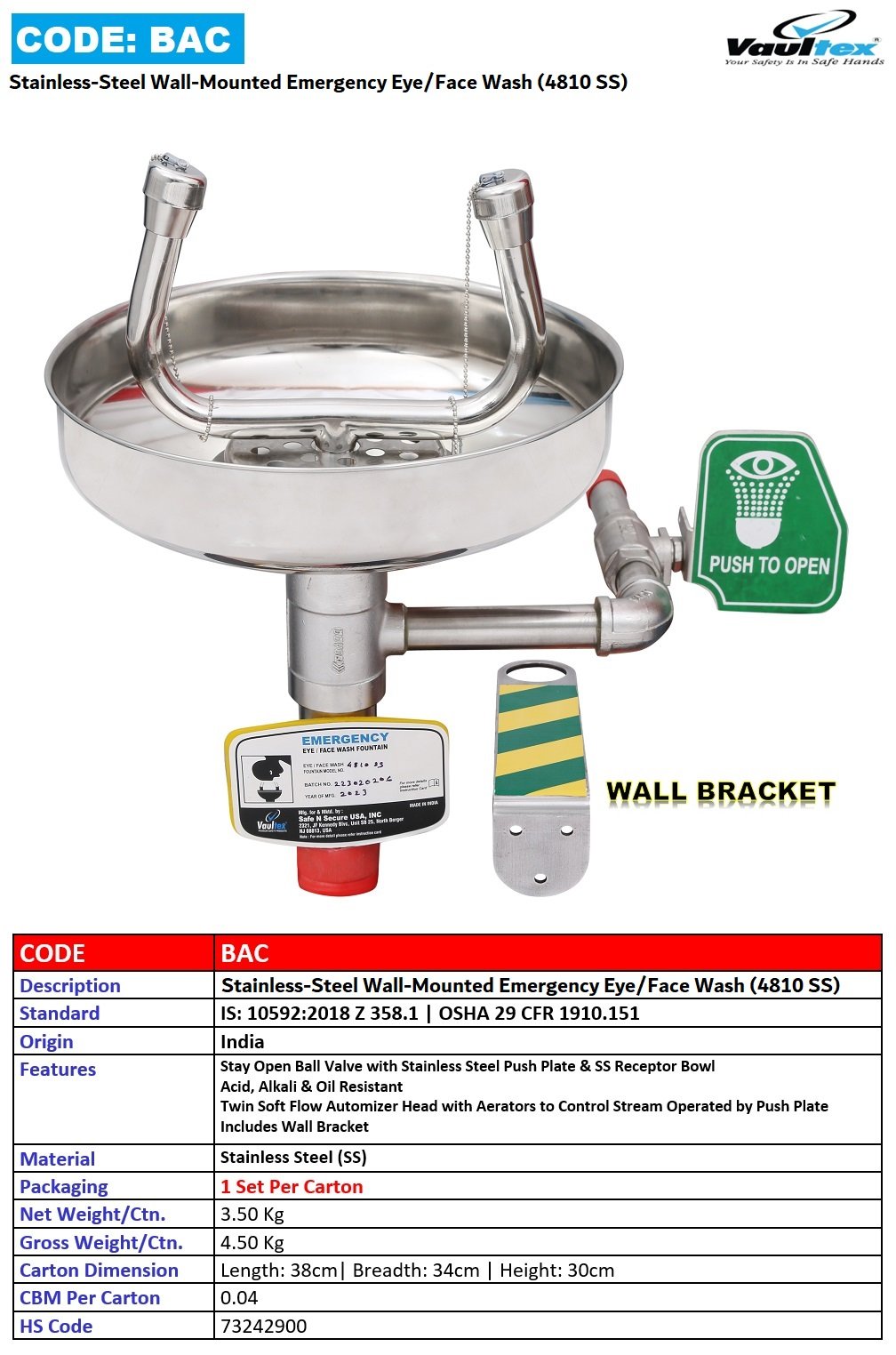 Stainless-Steel Emergency Wall-Mounted Eye/Face Wash Station (4810 SS)